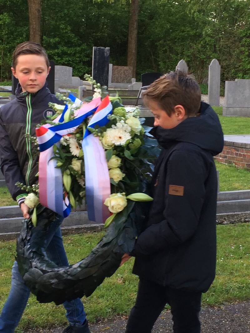 Bij de oorlogsgraven word een krans geplaatst, en de leerlingen van een basisschool plaatsen bloemen.