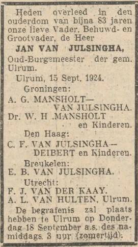 gehuwd ; 06-07-1841 te Ulrum met Luukje Kremer ( begraven rij 6 nr. 11)