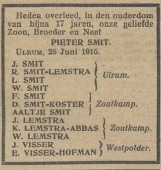 overl.; 25-06-1915 te Ulrum , 16 jaar